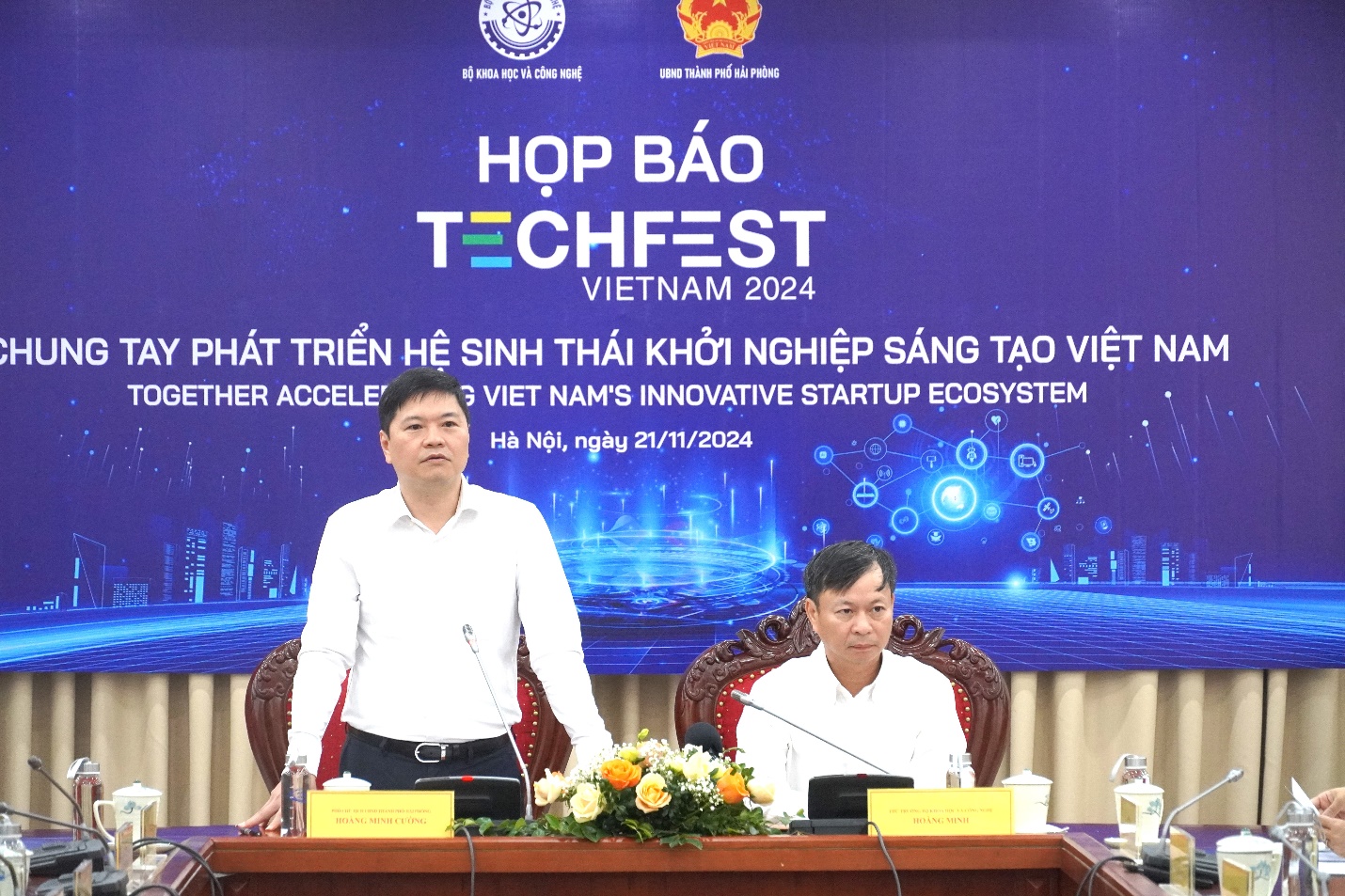 Phát biểu tại cuộc họp báo, Thứ trưởng Bộ KH&CN Hoàng Minh khẳng định: TECHFEST Việt Nam 2024 là dịp để nhìn lại chặng đường phát triển của hệ sinh thái KNST Việt Nam, từ đó thúc đẩy hợp tác, tìm kiếm cơ hội đầu tư và kết nối các ý tưởng đổi mới sáng tạo với cộng đồng doanh nghiệp, quỹ đầu tư. Năm 2024, Việt Nam đã có những bước tiến đáng kể trên bản đồ khởi nghiệp toàn cầu, đạt vị trí 56 trong bảng xếp hạng Startup Blink năm 2024. Đặc biệt, các thành phố lớn như Hà Nội và thành phố Hồ Chí Minh lọt vào top 200 thành phố KNST toàn cầu.